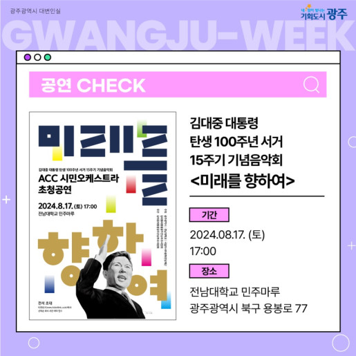 “김대중 대통령 탄생 100주년과 서거 15주기를 맞이하여 특별한 음악회 ‘미래를 향하여’를 개최합니다. 김대중 대통령의 위대한 업적과 미래에 대한 비전을 기리기 위한 이번 음악회에서는 그의 사상과 꿈을 음악으로 만끽할 수 있는 기회를 제공합니다. 감동적인 무대와 함께 그가 남긴 유산을 되새기며 미래를 향한 희망의 메시지를 함께 나누세요.”
